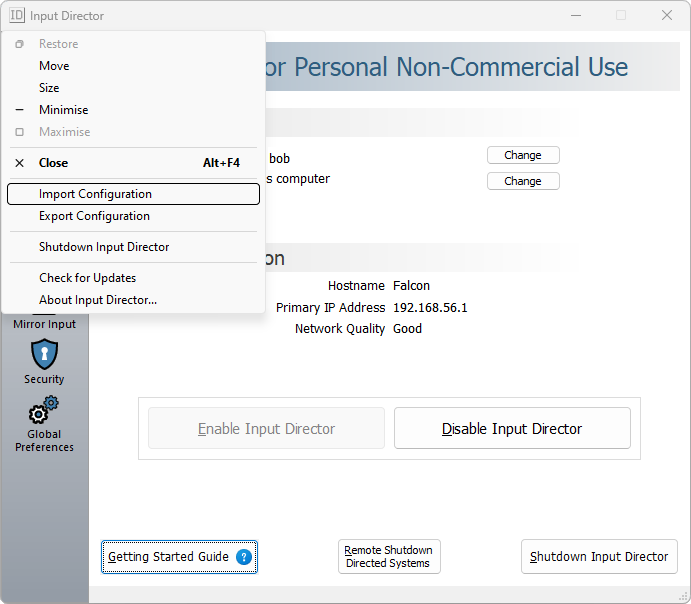 The configuration for Input Director can be imported and exported as a file. This can be used to for a variety of purposes, from migrating the configuration from one computer to another or to change a single setting.