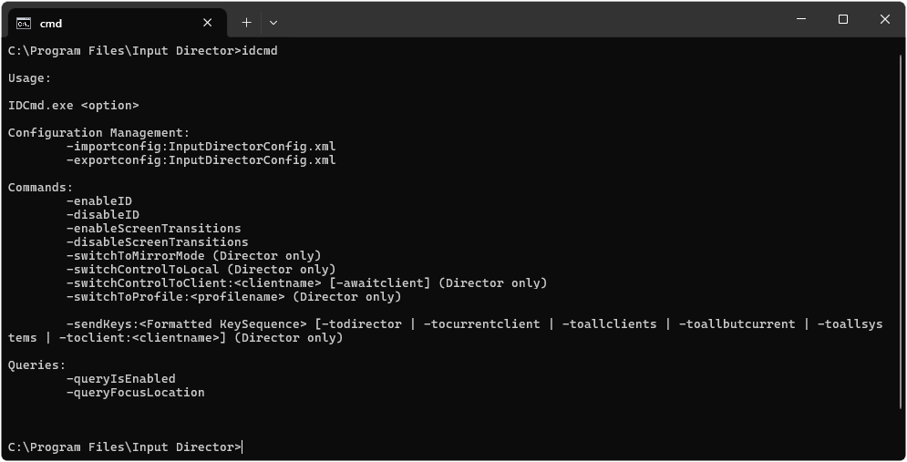 Input Director includes a command line tool that can be used to import/export its configuration, query its status or send it a command to action.